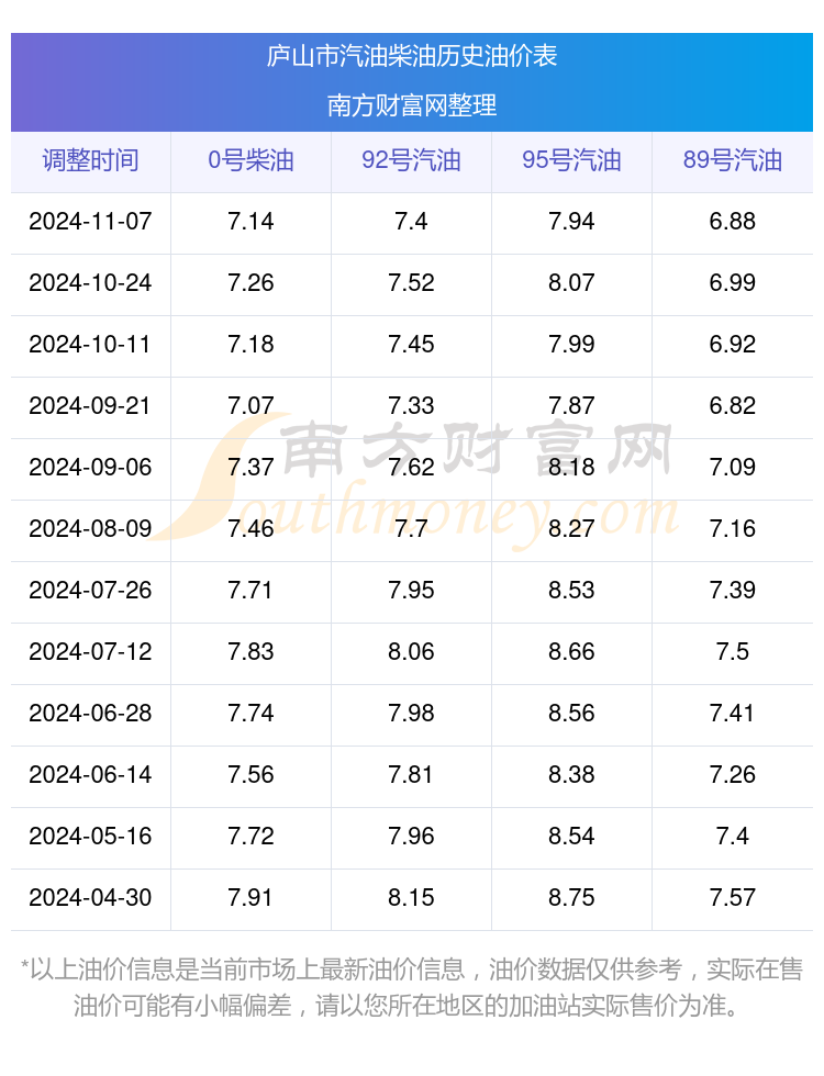 庐山市汽油、柴油11月24日每升最新价格为:95号汽油为7.94元,下调了0.13元;92号汽油为7.4元,下调了0.12元;89号汽油为6.88元,下调了0.11元;0号柴油为7.14元,下调了0.12元,调整时间为11月7日。