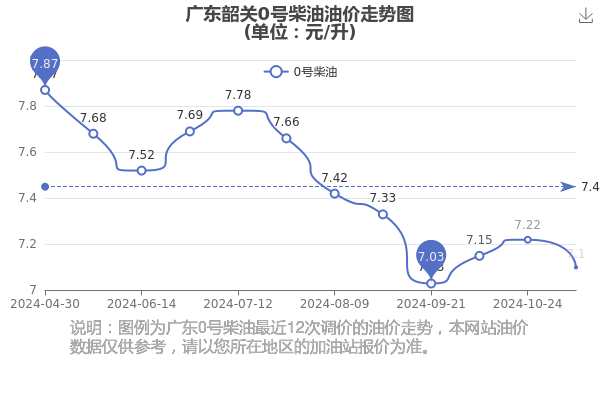 广东韶关0号柴油11月24日最新价格为7.1元/升,调整时间为11月7日,相对上次调整时间10月24日的油价7.22元每升,下降了0.12元,下降1.662%。