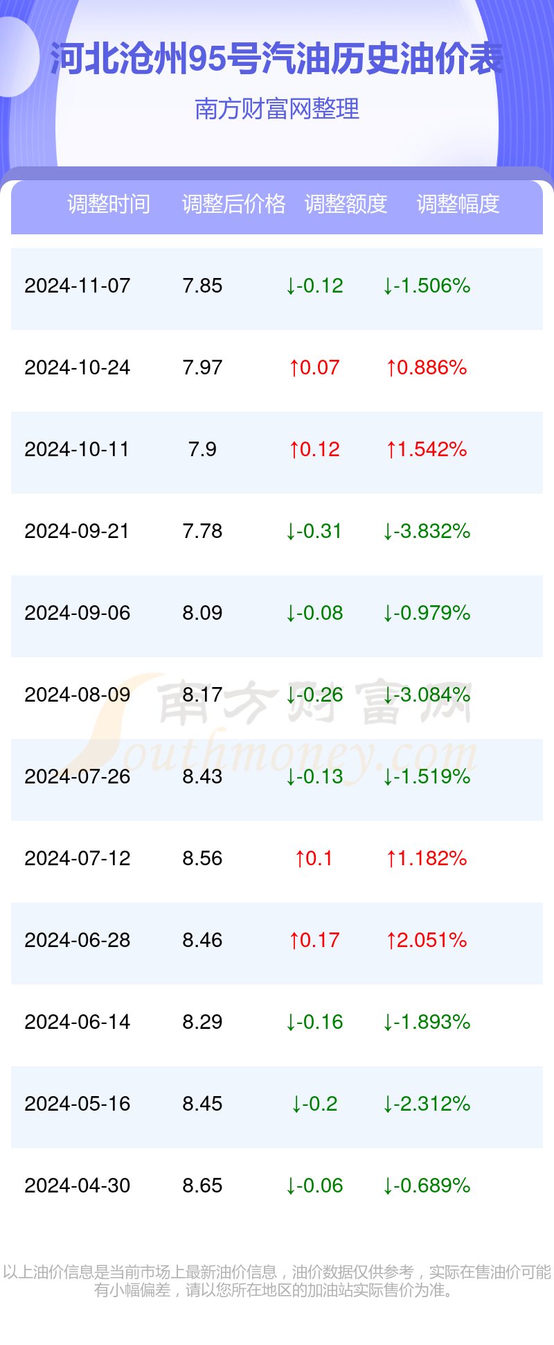 河北沧州95号汽油历史油价表