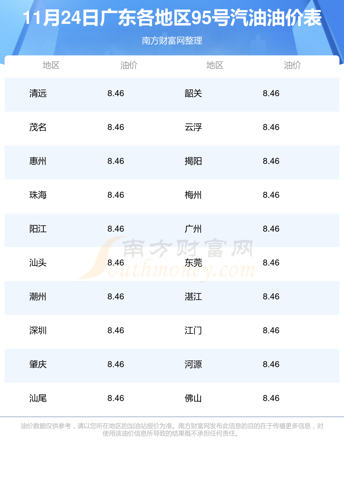 以上数据仅供参考,请以您所在地区的加油站实际售价为准。油价发布此信息的目的在于传播更多信息,对使用该油价信息所导致的结果概不承担责任。