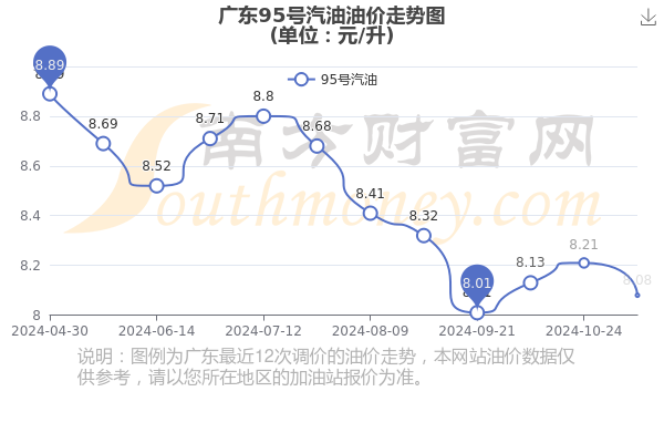 广东95号汽油11月24日价格为8.08元/升,调整时间为11月7日,对比上次调整减了0.13元。