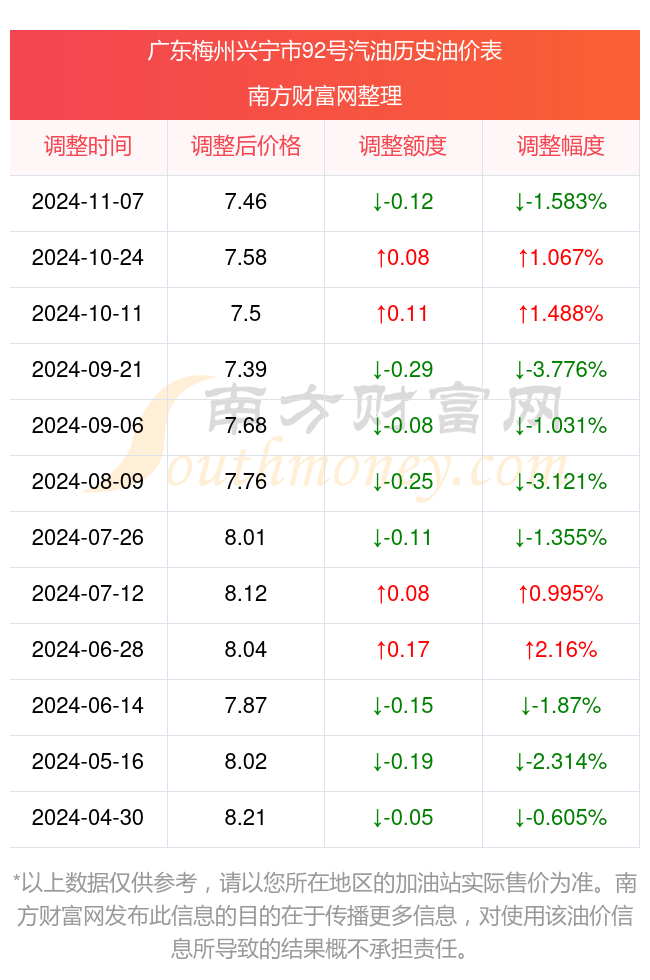 11月24日广东梅州兴宁市92号汽油的最新价格:广东梅州兴宁市92号汽油7.46元/升(根据11月7日调整后的价格),相对上次调整时间10月24日的油价7.58元每升,下调了0.12元,下调1.583%。