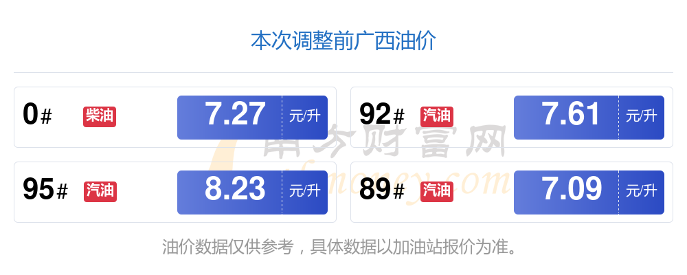 广西汽油、柴油11月24日每升最新价格多少钱一升?本次油价调整时间为11月7日,92号汽油为7.5元,降了0.11元;95号汽油为8.1元,降了0.13元;89号汽油为6.98元,降了0.11;0号柴油为7.15元,降了0.12元。