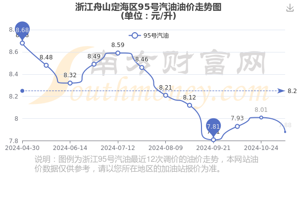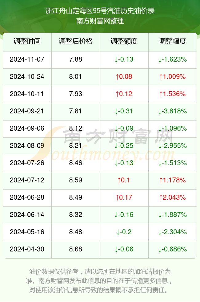 11月24日,浙江舟山定海区95号汽油今日价格(调整时间为11月7日):7.88元每升,对比上次调整(10月24日)的油价8.01元每升,共下跌了0.13元,下跌幅达1.623%。