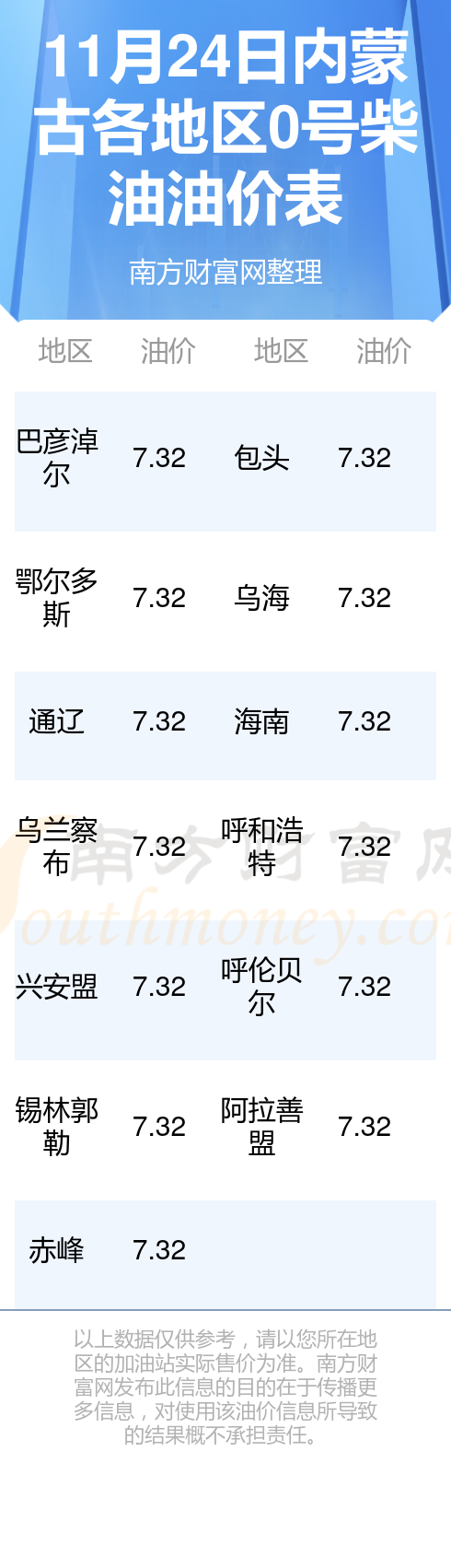 11月24日,内蒙古0号柴油最新油价是6.97元每升,本轮调整时间为11月7日,相对上轮调整时间9月21日的油价7.09元/升,下跌了0.12元。