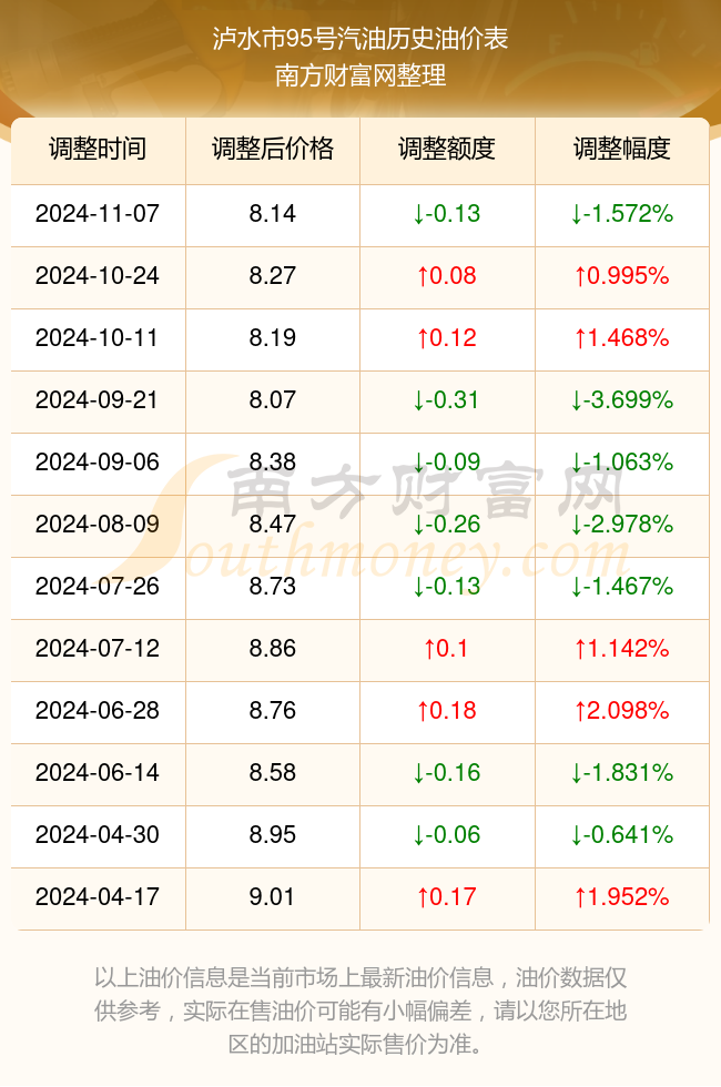 泸水市95号汽油历史油价表
