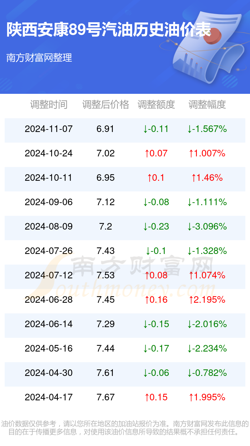 11月24日陕西安康89号汽油价格:6.91元每升,调整时间为11月7日,相对上次调整下降了0.11元。