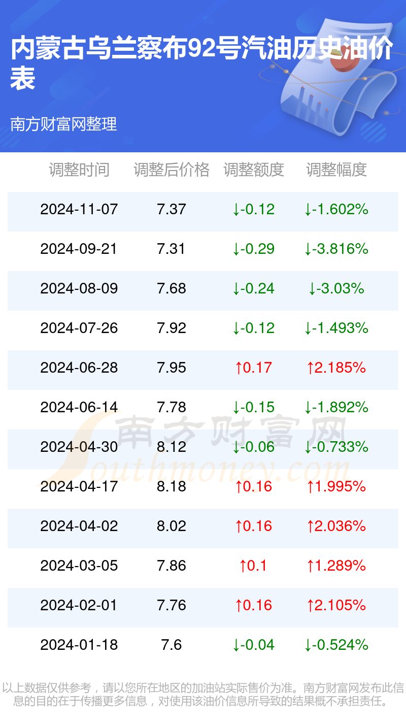 内蒙古乌兰察布92号汽油历史油价表