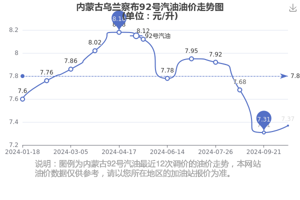 内蒙古乌兰察布92号汽油历史油价走势图
