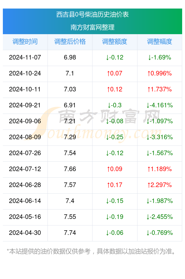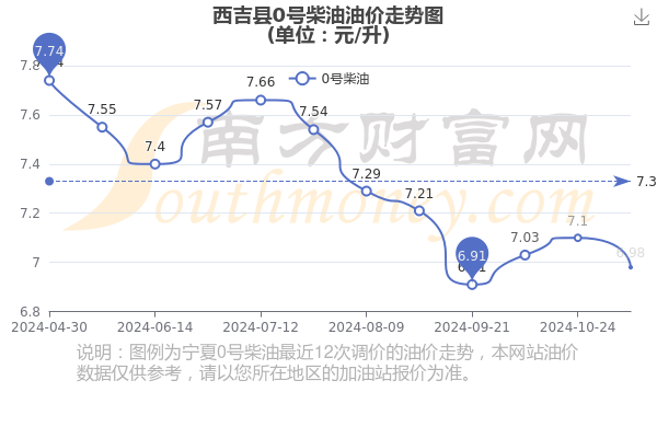 11月24日西吉县0号柴油的价格为11月7日调整后的价格,具体为:6.98元每升,相对上次调整时间10月24日的油价7.1元每升,减了0.12元,减幅达1.69%。