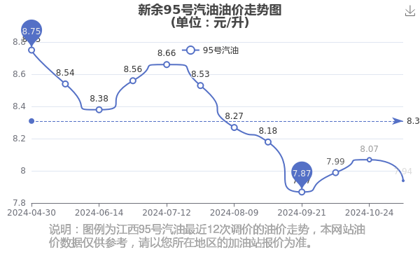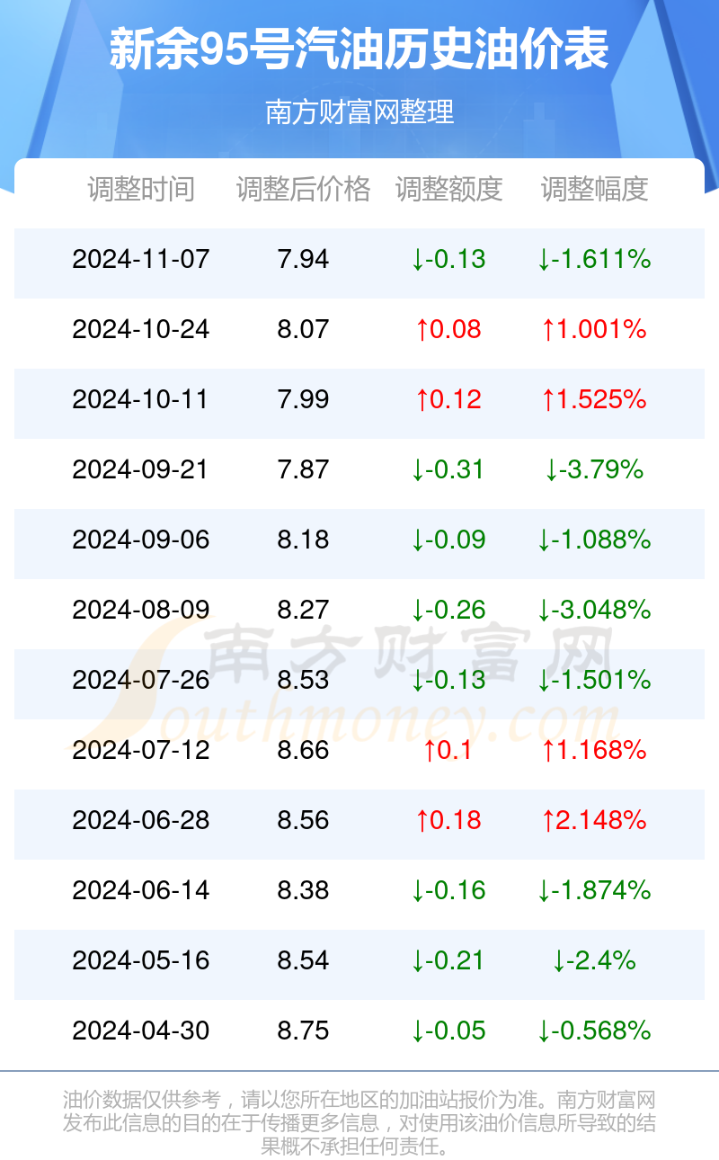 11月24日新余95号汽油价格查询:每升7.94元(11月7日油价调整后的价格),相对上次调整时间10月24日的油价8.07元每升,跌了0.13元,跌1.611%。