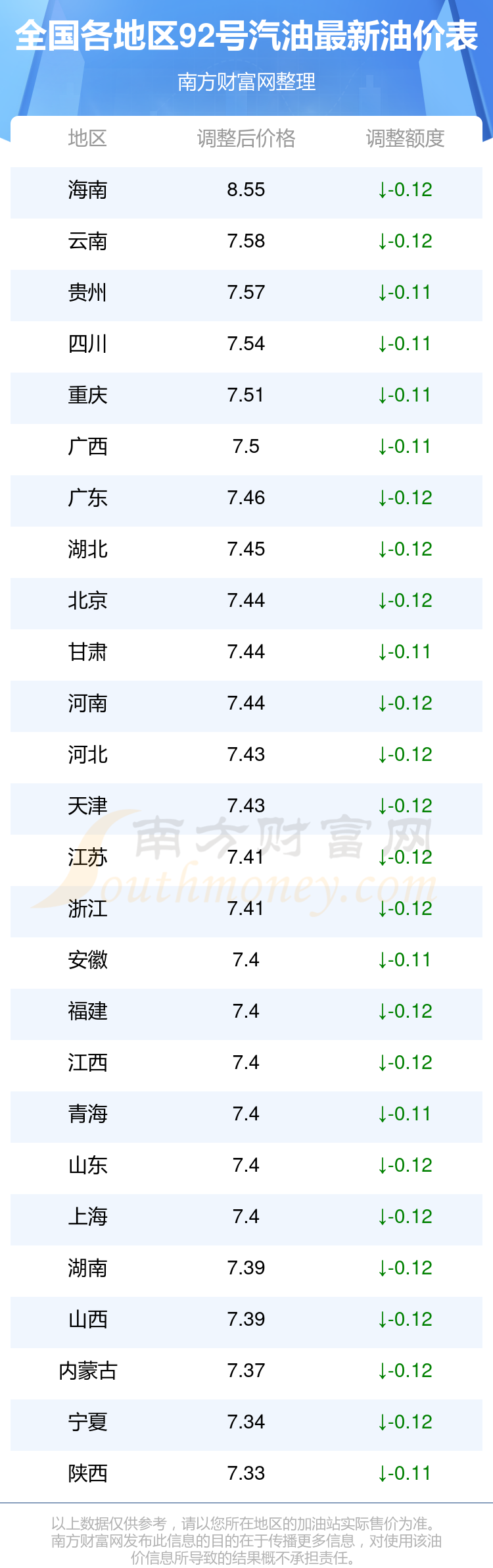全国92号汽油11月24日最新平均价格为:7元/升,调整时间为11月7日,其中全国92号汽油最低为陕西,价格为7.33元/升,92号汽油最高为海南,价格为8.55元/升。