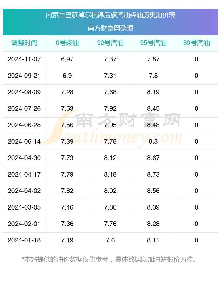 内蒙古巴彦淖尔杭锦后旗历史油价表