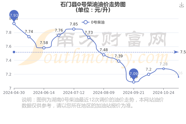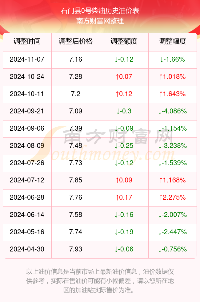 11月24日石门县0号柴油的价格为11月7日油价调整后的价格,具体是每升7.16元,相对上次调整时间10月24日的油价7.28元每升,共下降了0.12元,下降1.66%。