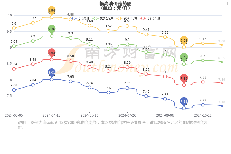 11月24日,临高汽油、柴油每升最新价格:本轮的油价调整时间是11月7日,92号汽油为8.55元,减了0.12元,减幅达1.38%;95号汽油为9.08元,减了0.13元,减幅达1.41%;89号汽油为7.89元,减了0.11元,减幅达1.38%;0号柴油为7.18元,减了0.12元,减幅达1.64%。