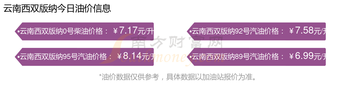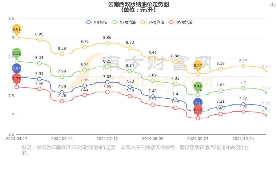 云南西双版纳汽油、柴油11月24日每升的价格为11月7日调整后的价格,具体油价为:92号汽油7.58元;95号汽油8.14元;89号汽油6.99元;0号柴油7.17元。