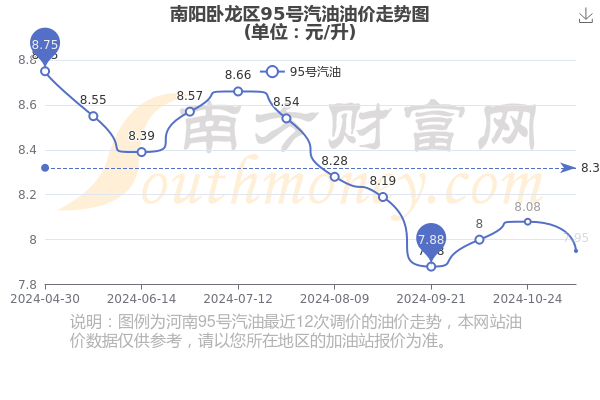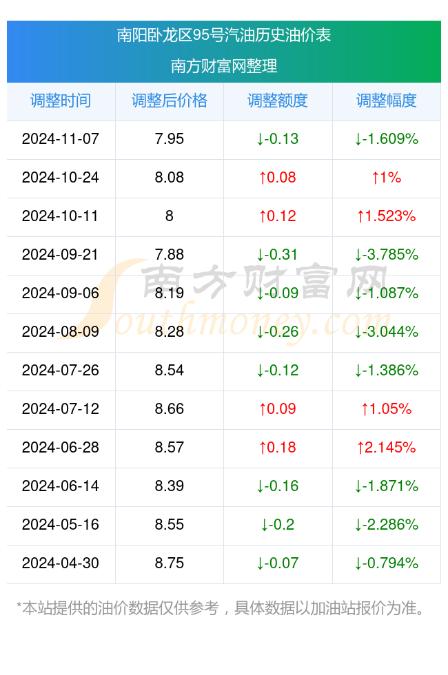 11月24日,南阳卧龙区95号汽油的价格为7.95元/升,这是11月7日油价调整后的价格,对比上一轮油价调整时间10月24日的价格8.08元每升,下调了0.13元,下调幅达1.609%。