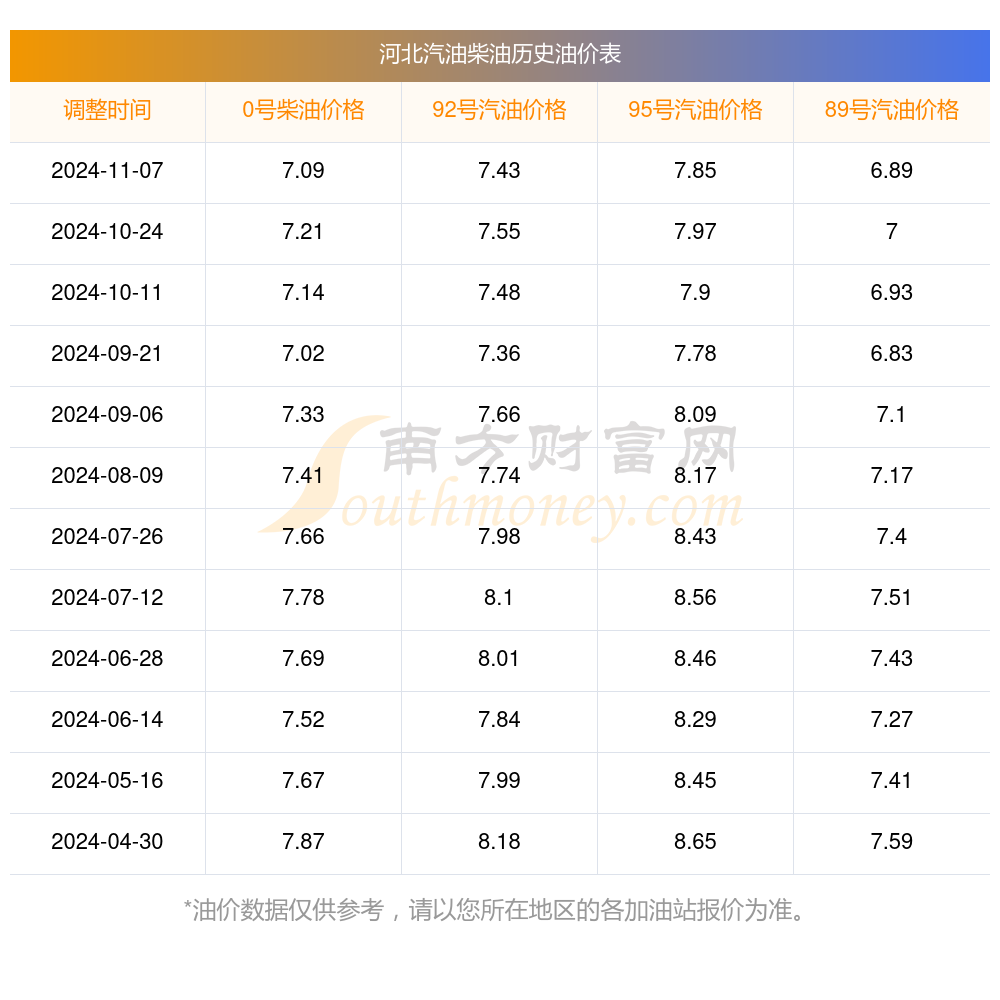 11月24日河北汽油、柴油的价格多少钱一升?本轮油价调整时间是11月7日,92号汽油7.43元,下调了0.12元,下调幅达1.59%;95号汽油7.85元,下调了0.12元,下调幅达1.51%;89号汽油6.89元,下调了0.11元,下调幅达1.57%;0号柴油7.09元,下调了0.12元,下调幅达1.66%。