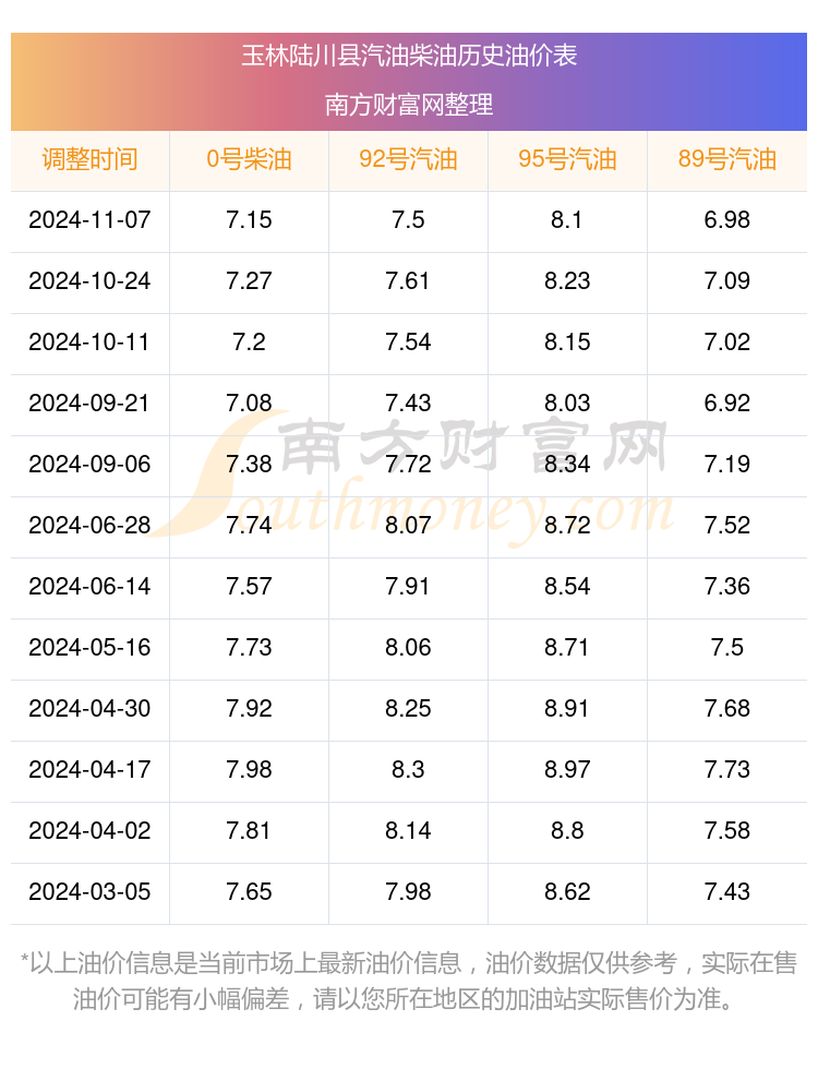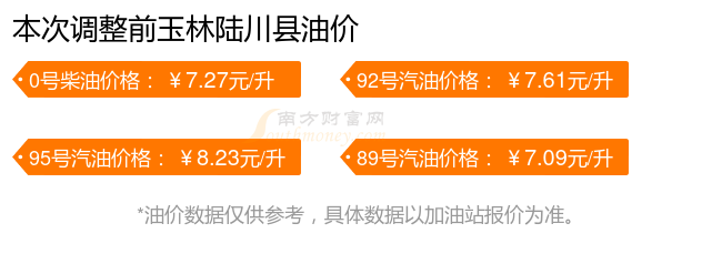 玉林陆川县汽油、柴油11月24日每升最新价格为:0号柴油为7.15元,跌了0.12元;95号汽油为8.1元;92号汽油为7.5元;89号汽油为6.98元,调整时间为11月7日。