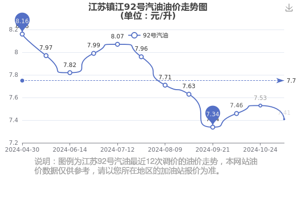 江苏镇江92号汽油11月24日价格查询:11月7日油价调整后,江苏镇江92号汽油7.41元/升,相对上次调整时间10月24日的油价7.53元每升,降了0.12元,降1.594%。