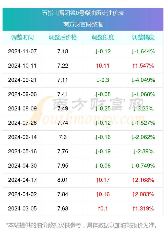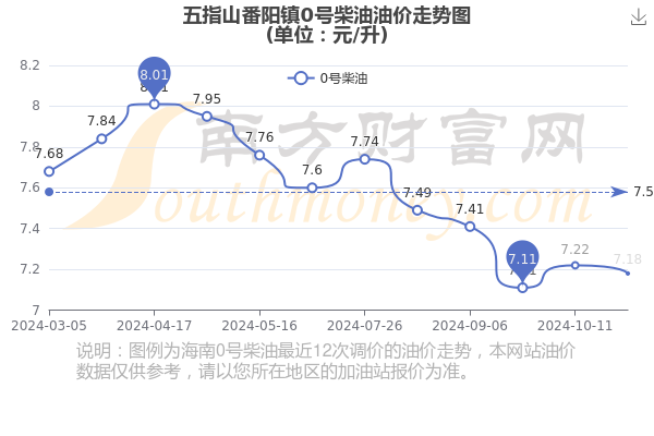 11月24日五指山番阳镇0号柴油的价格是11月7日调整后的价格,具体为7.18元/升,对比上次调整时间10月11日的油价7.3元每升,下调了0.12元,下调幅达1.644%。