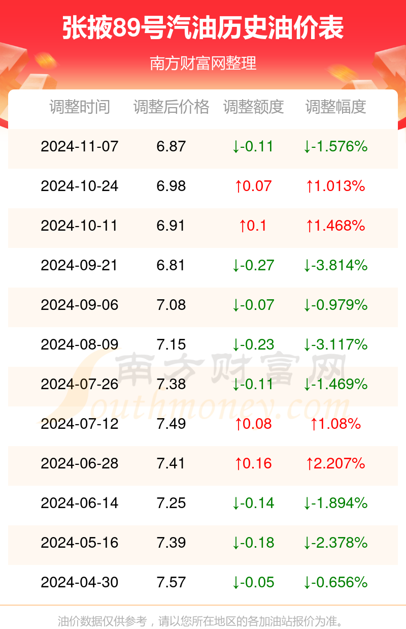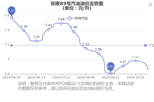 张掖89号汽油11月24日最新价格为6.87元/升,为11月7日油价调整后的价格,相对上次调整时间10月24日的油价6.98元每升,下跌了0.11元,下跌1.576%。