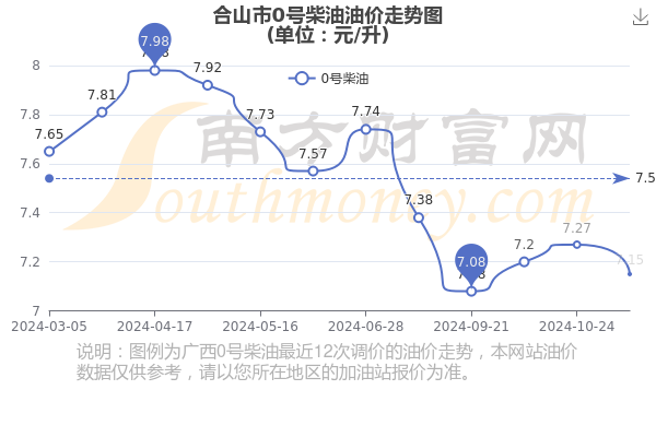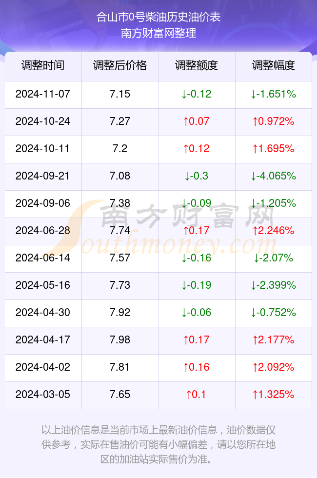 11月24日合山市0号柴油的价格为11月7日油价调整后的价格,每升7.15元,对比上一轮油价调整时间10月24日的价格7.27元每升,跌了0.12元,跌幅达1.651%。