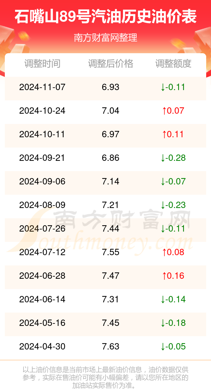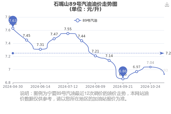 石嘴山89号汽油11月24日的价格为11月7日调整后的价格,具体为6.93元/升,相对上次调整下跌了0.11元。