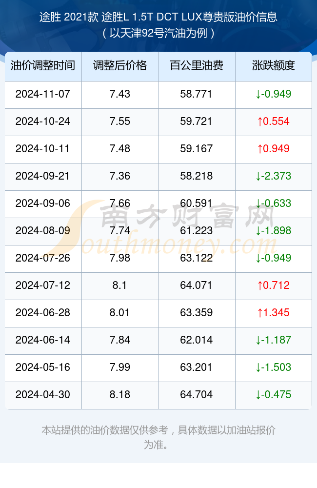 根据11月7日92号汽油最新调整价格7.43元/升来计算(以天津为例),该车型每百公里的平均油费是58.771元,上一轮10月24日调整价格7.55元每升来计算,每百公里的平均油费是59.721元,对比上一轮少花0.949元,下一轮的油价调整时间是12月2日24时。