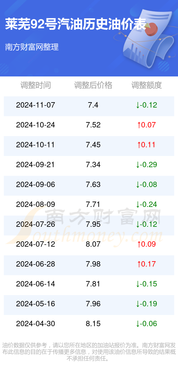 11月24日莱芜92号汽油的价格为7.4元/升,这是11月7日调整后的价格,相对上次调整时间10月24日的油价7.52元每升,减了0.12元,减幅达1.596%。
