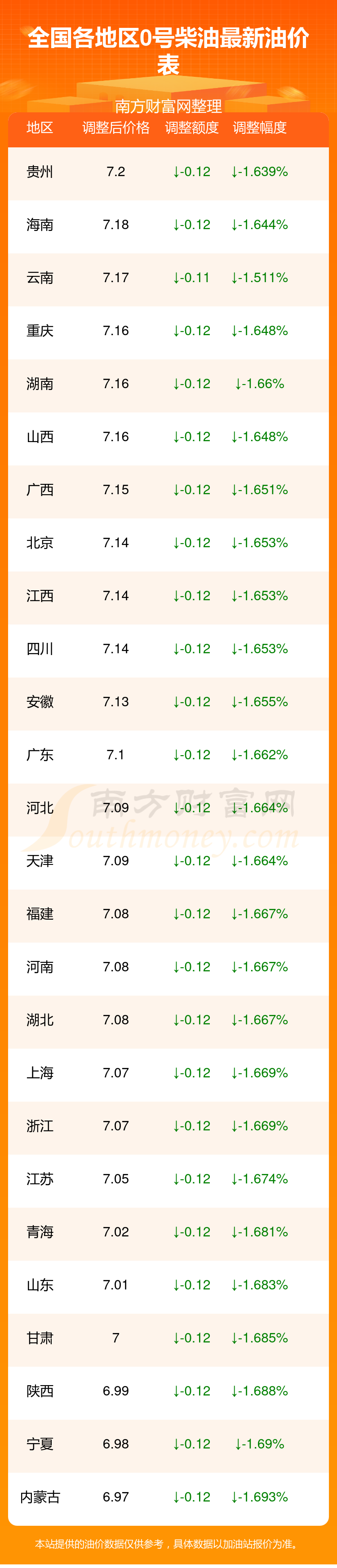 全国0号柴油11月24日最新平均价格为7元/升,调整时间为11月7日。其中,全国0号柴油最低为内蒙古,价格为6.97元/升;0号柴油最高为贵州,价格为7.20元/升。
