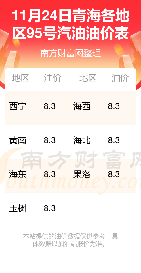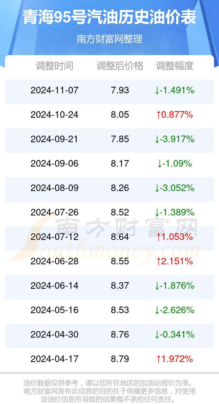 11月24日青海95号汽油价格为7.93元/升,调整时间为11月7日,相对上次调整时间10月24日的油价8.05元/升,减了0.12元。