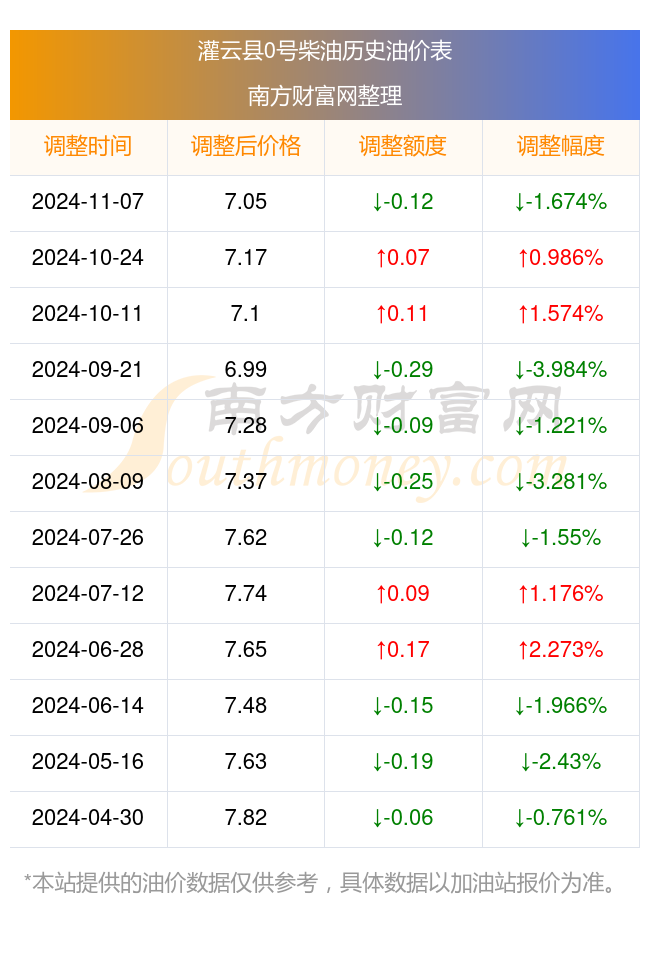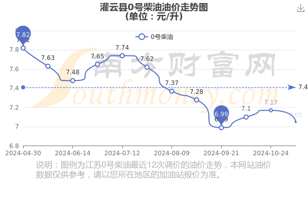 11月24日灌云县0号柴油的价格为11月7日调整后的价格,具体为:7.05元每升,相对上次调整时间10月24日的油价7.17元每升,下调了0.12元,下调幅达1.674%。