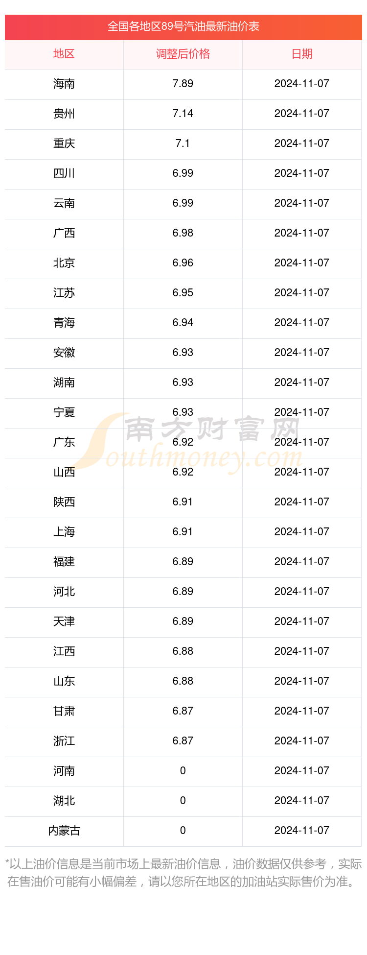 全国89号汽油11月24日的最新价格是11月7日油价调整后的价格,当中,平均价格为7元/升,最低的是浙江,价格6.87元/升,最高的是海南,价格7.89元/升。