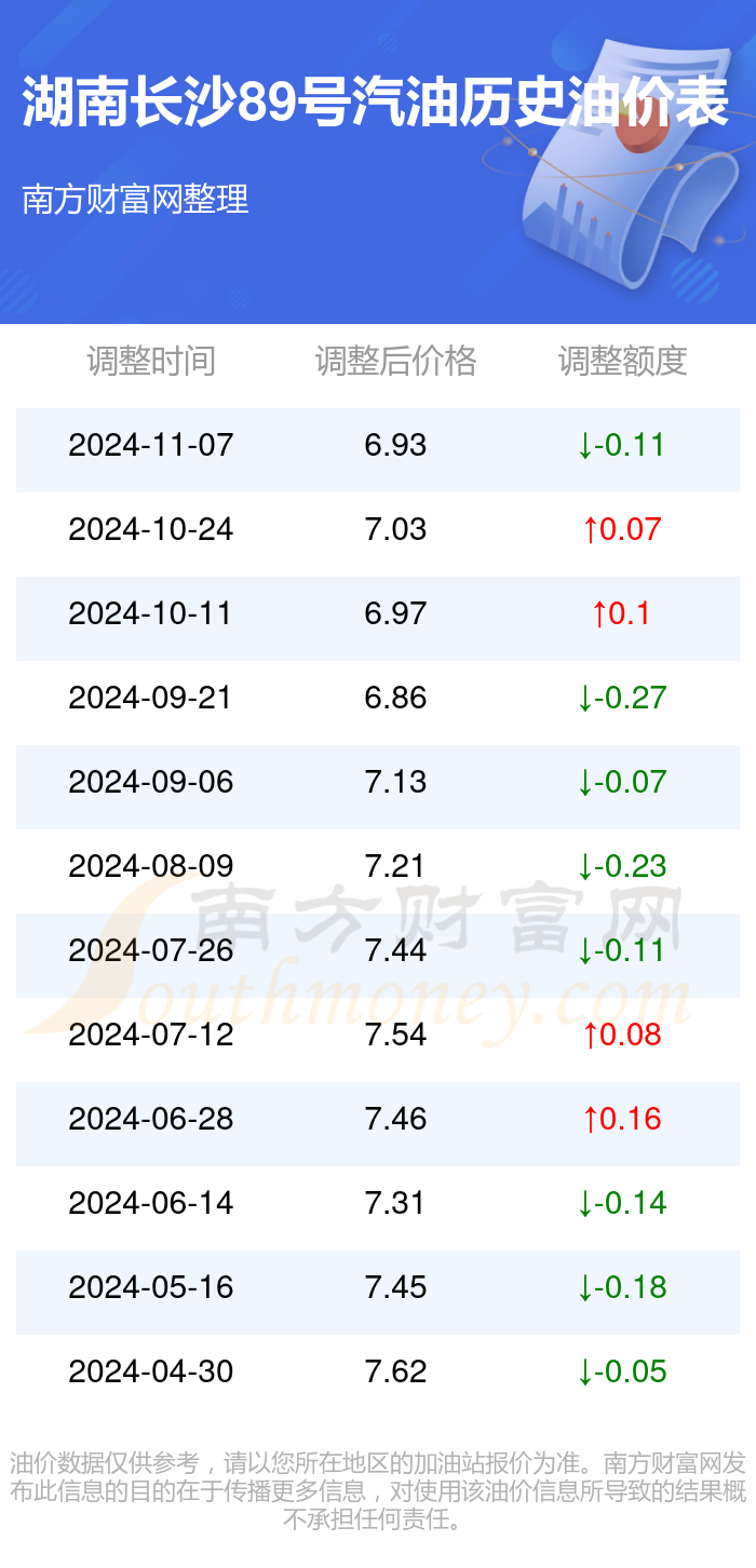 11月24日湖南长沙89号汽油的价格为6.93元每升,本次调整时间为11月7日,相对上次调整时间10月24日的油价7.03元每升,减了0.11元,减幅达1.536%。