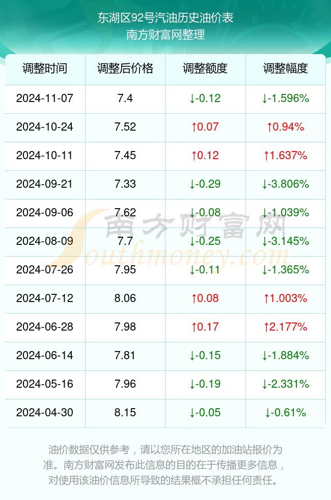 东湖区92号汽油11月24日的价格为11月7日调整后的价格,具体为7.4元/升,相对上次调整下跌了0.12元。