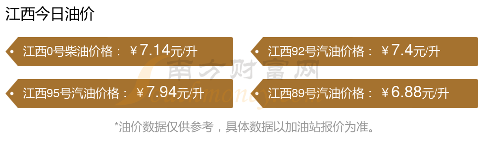 江西汽油、柴油11月24日每升最新价格为:92号汽油为7.4元;95号汽油为7.94元;89号汽油为6.88元,减了0.11;0号柴油为7.14元,调整时间为11月7日。