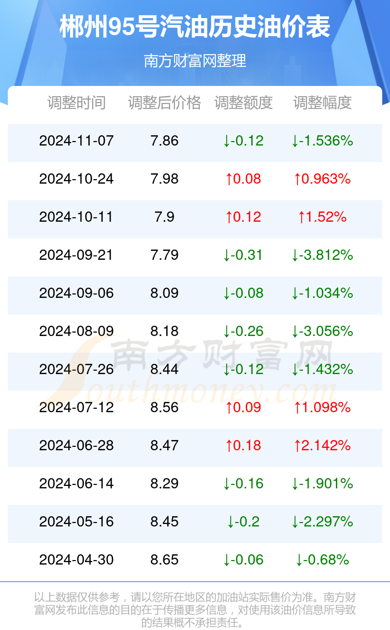 郴州95号汽油历史油价表