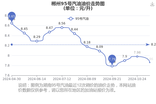 11月24日,郴州95号汽油的价格为7.86元/升,这是11月7日油价调整后的价格,对比上一轮油价调整时间10月24日的价格7.98元每升,下调了0.12元,下调幅达1.536%。