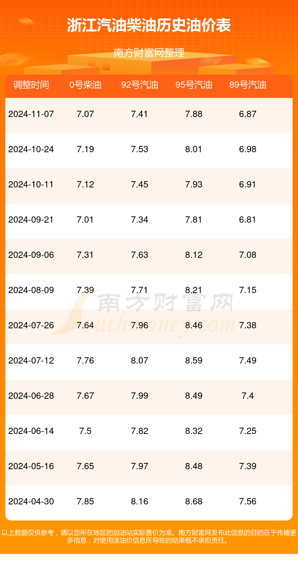 11月24日浙江汽油、柴油最新价格:本次油价调整时间是11月7日,92号汽油7.41元,下调了0.12元,下调幅达1.59%;95号汽油7.88元,下调了0.13元,下调幅达1.62%;89号汽油6.87元,下调了0.11元,下调幅达1.58%;0号柴油7.07元,下调了0.12元,下调幅达1.67%。