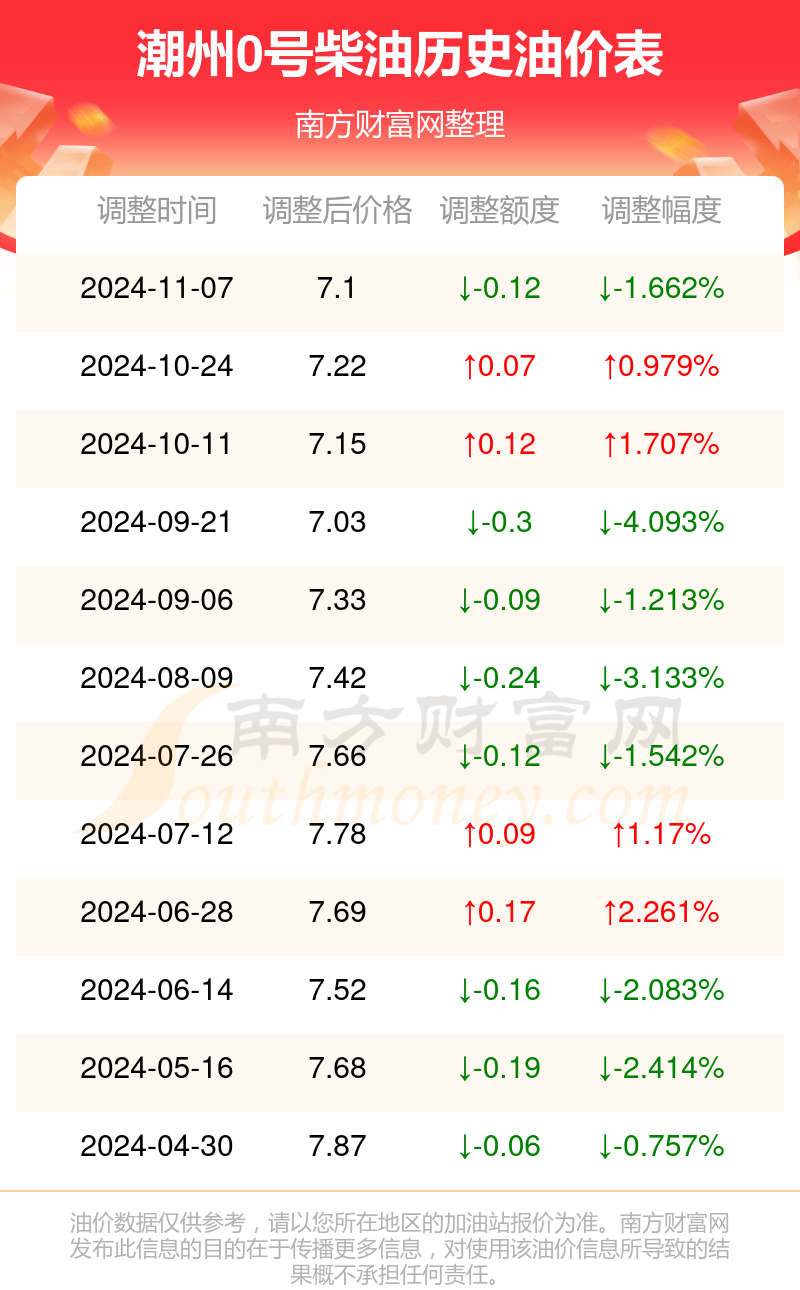 11月24日潮州0号柴油的价格为7.1元/升,本轮油价的调整时间为11月7日,相对上一轮油价调整时间10月24日的价格7.22元/升,跌了0.12元,跌幅达1.662%。