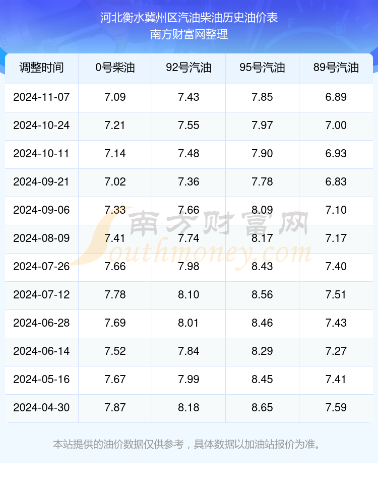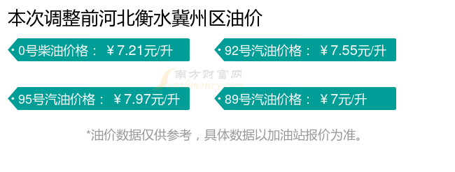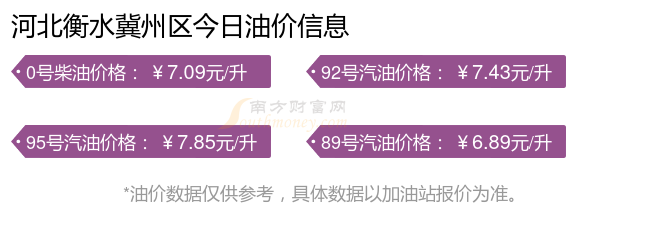 11月24日河北衡水冀州区汽油、柴油每升价格:距离最近的油价调整时间是11月7日,92号汽油为7.43元,下调了0.12元,下调幅达1.59%;95号汽油为7.85元,下调了0.12元,下调幅达1.51%;89号汽油为6.89元,下调了0.11元,下调幅达1.57%;0号柴油为7.09元,下调了0.12元,下调幅达1.66%。