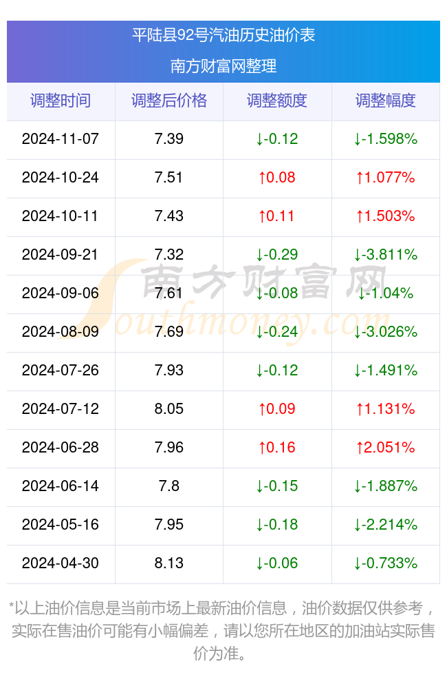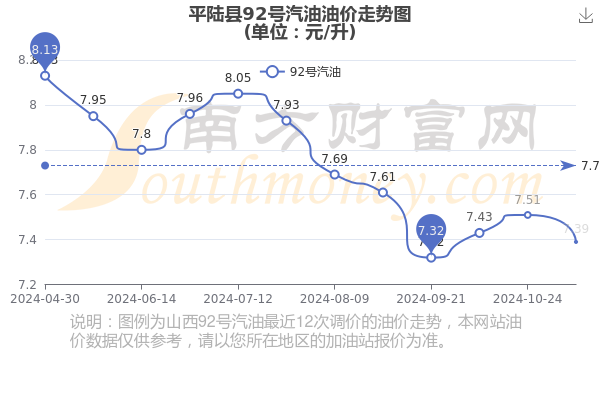 平陆县92号汽油11月24日的最新价格:11月7日油价调整后,平陆县92号汽油7.39元/升,相对上次调整时间10月24日的油价7.51元每升,下调了0.12元,下调1.598%。