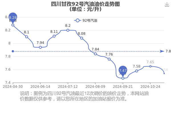 11月24日四川甘孜92号汽油价格:7.54元每升,调整时间为11月7日,相对上次调整降了0.11元。