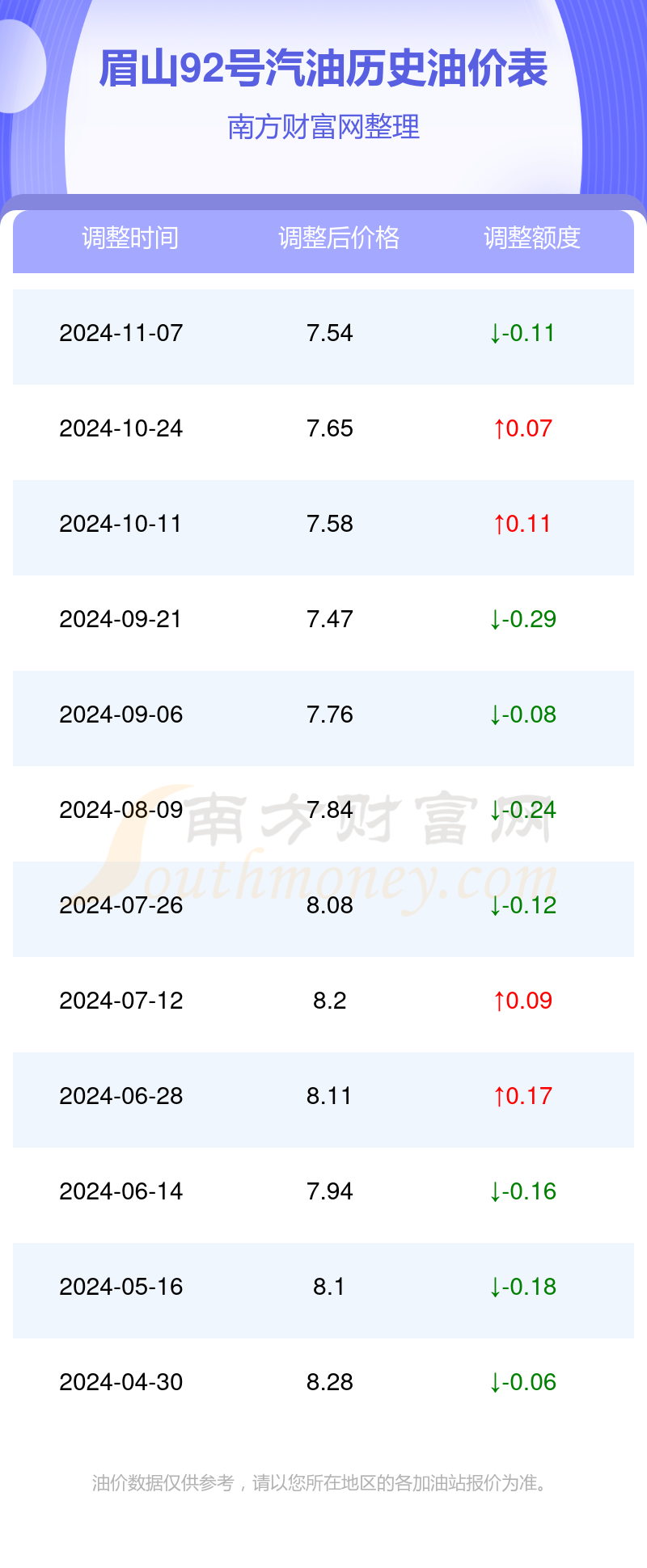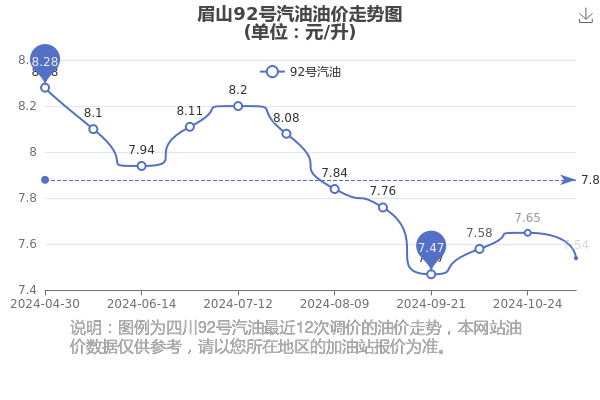 眉山92号汽油11月24日最新价格为7.54元/升,为11月7日油价调整后的价格,相对上次调整时间10月24日的油价7.65元每升,下调了0.11元,下调1.438%。