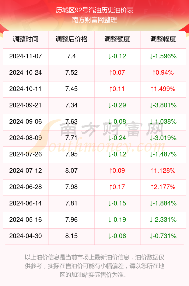 11月24日历城区92号汽油的价格为11月7日调整后的价格,具体为:7.4元每升,相对上次调整时间10月24日的油价7.52元每升,下调了0.12元,下调幅达1.596%。