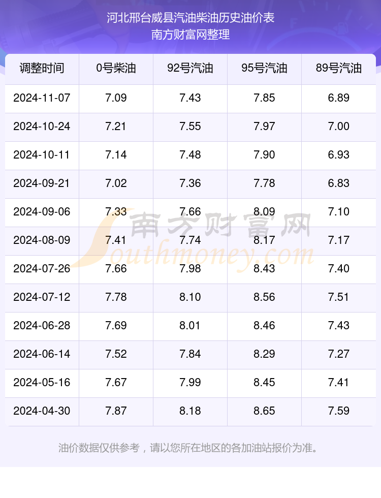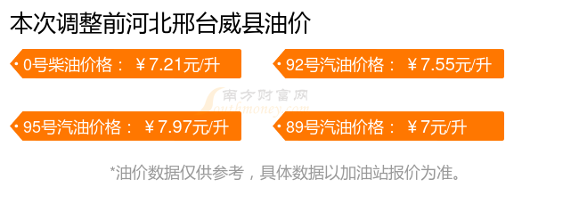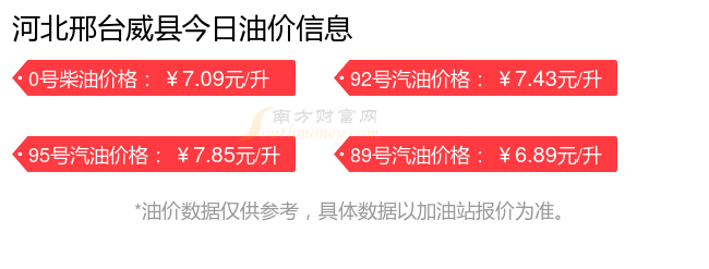 河北邢台威县汽油、柴油11月24日每升最新价格:92号汽油为7.43元;95号汽油为7.85元;89号汽油为6.89元;0号柴油为7.09元,本轮油价调整时间为11月7日。