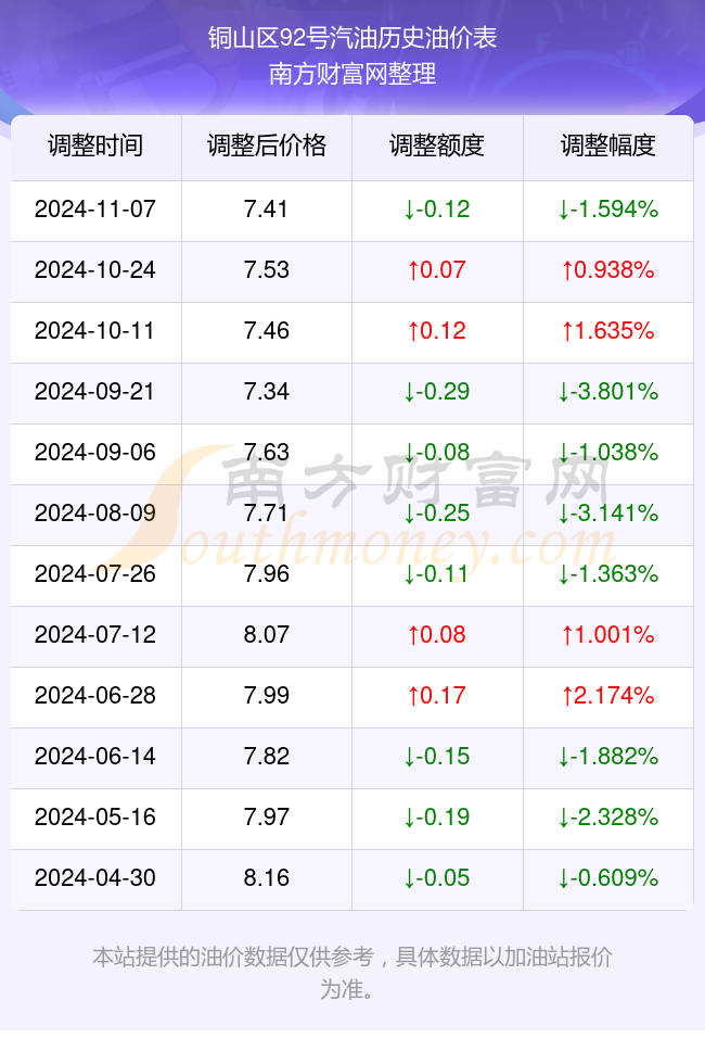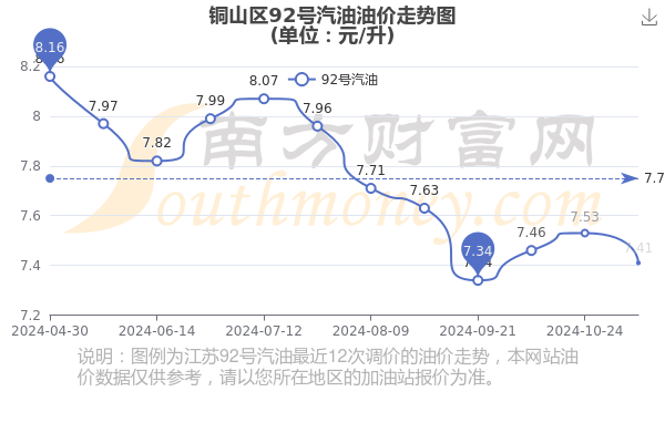 11月24日铜山区92号汽油价格:7.41元每升,调整时间为11月7日,相对上次调整跌了0.12元。