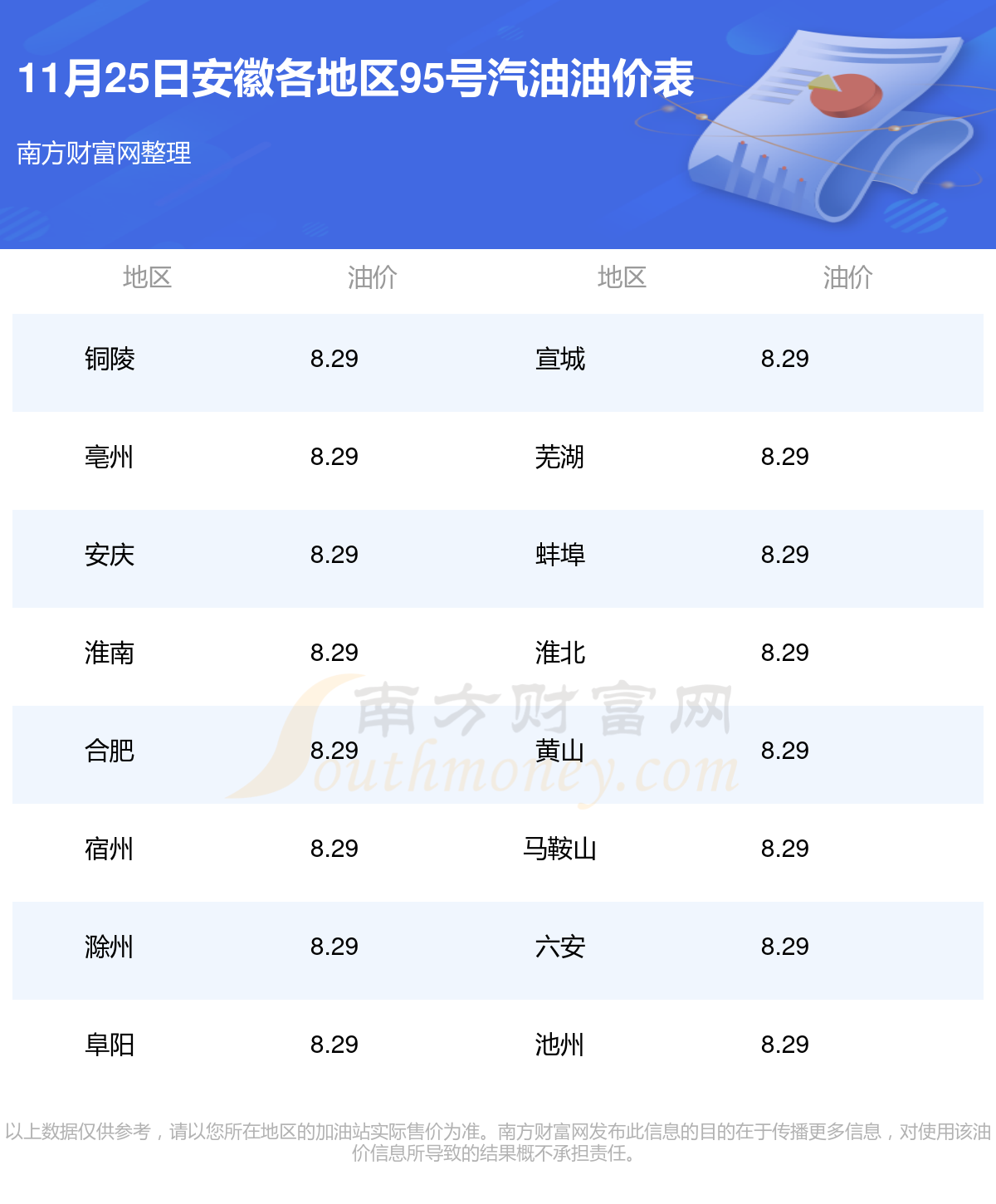 以上数据仅供参考,请以您所在地区的加油站实际售价为准。油价发布此信息的目的在于传播更多信息,对使用该油价信息所导致的结果概不承担责任。
