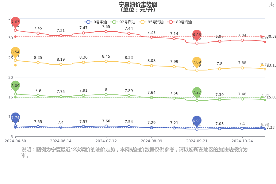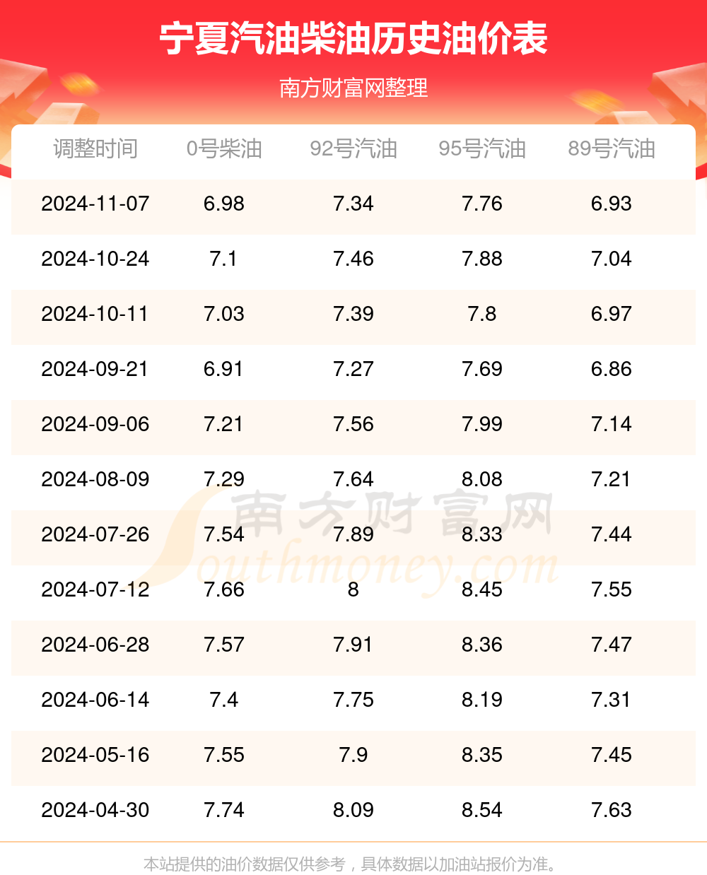 11月25日宁夏汽油、柴油每升的最新价格:92号汽油7.34元;95号汽油7.76元;89号汽油6.93元,下降了0.11;0号柴油6.98元,本轮油价的调整时间是11月7日。